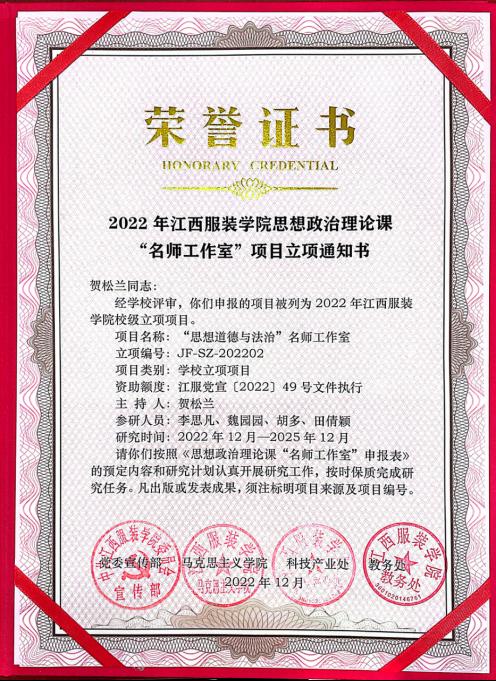 工作室教师积极参与科研项目,关注思政教育领域的前沿问题,在相关课题研究和论文发表方面取得了一定成绩。已主持和参与多项省级科研项目,如贺松兰老师主持的江西省高校人文社科项目(思政专项)“乡村振兴视域下农村志愿服务效益研究——以莲花县为例”等,为教学提供了有力的理论支持。