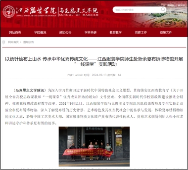 1.组织师生赴新余夏布绣博物馆开展“一线课堂”实践活动:让师生深入了解夏布绣的历史文化内涵,体验非物质文化遗产的魅力,引导学生传承和弘扬中华优秀传统文化。