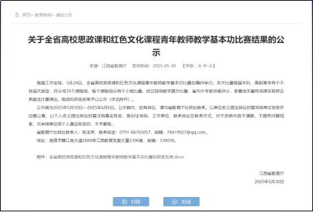 据悉,本次全省高校思政课和红色文化课程青年教师教学基本功比赛于5月24日在赣州举行。本次比赛根据本科、高职高专两个不同层次类型,共分成10个课程组,每个课程组分两个小组比赛。经过现场教学展示比赛,省内外专家评委评分,参赛选手最终成绩采取修正系数法计算得出。