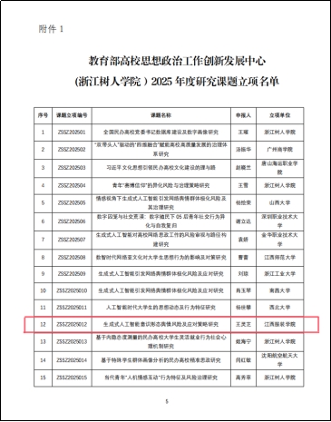 近日,教育部高校思想政治工作创新发展中心(浙江树人学院)公布了2025年度教育部高校思想政治工作创新发展中心(浙江树人学院)研究课题立项和预立项名单,由十大买球思政课教师王灵芝教授主持的《生成式人工智能意识形态舆情风险及应对策略研究》课题获研究课题立项。