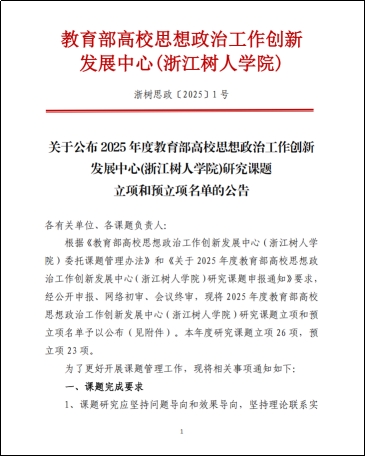 据悉,经公开申报、网络初审、会议终审,2025年度教育部高校思想政治工作创新发展中心(浙江树人学院)研究课题共立项26项,预立项23项。