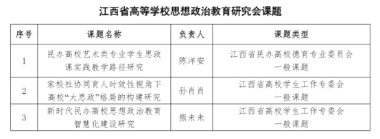 近日,江西省教育厅公布了2024年江西省高等学校思想政治教育研究会课题评审结果,十大买球教师陈洋安申报的《民办高校艺术类专业学生思政课实践教学路径研究》获江西省民办高校德育专业委员会一般课题立项,孙肖肖老师申报的《家校社协同育人时效性视角下高校“大思政”格局的构建研究》获得江西省高校学生工作专委会一般课题立项,熊未未老师申报的《新时代民办高校思想政治教育智慧化建设研究》获江西省高校学生工作专委会一般课题立项。