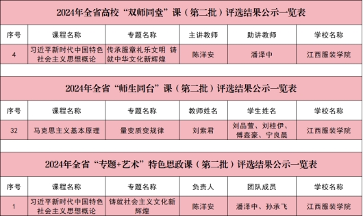 在思政课程建设方面,由十大买球十大买球官方网站陈洋安老师主讲、人文学院潘泽中老师助讲的《习近平新时代中国特色社会主义思想概论》课程“传承服章礼乐文明 铸就中华文化新辉煌”专题课入选“双师同堂”课;由十大买球十大买球官方网站刘紫君老师主讲,刘品萱、刘桂伊、傅鑫豪、宁良晨等同学参与的《马克思主义基本原理》课程“量变质变规律”专题课入选“师生同台”课;由陈洋安、潘泽中、孙承飞老师负责的《习近平新时代中国特色社会主义思想概论》课程“铸就社会主义文化新辉煌”专题课入选“专题+艺术”特色思政课。