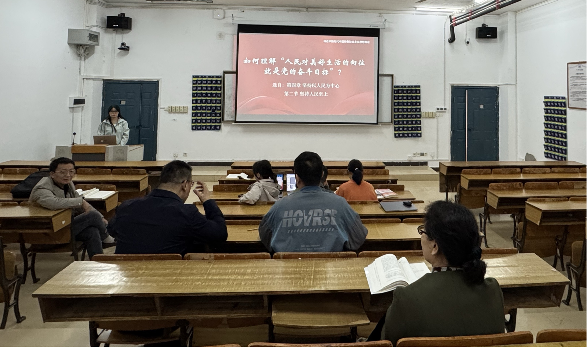 接着熊老师讲解了“如何理解人民对美好生活的向往就是党的奋斗目标?”进行了15分钟的教学展示。课程从初心使命、奋斗目标与主要矛盾三个维度层层展开:在初心使命层面,引用马克思主义经典论述与党的百年历程,阐明“让人民过上好日子”是党始终如一的价值追求;在奋斗目标层面,以江西神山村蝶变等案例,生动诠释“人民对美好生活的向往”如何成为新时代党的方向标;在现实矛盾层面,紧扣“美好生活需要和不平衡不充分发展”这一主要矛盾,结合养老、就业、教育等民生热点,呈现党如何把人民诉求转化为改革清单,将“向往”一步步变为现实。