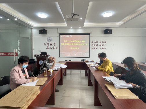 在检查工作前,学院副院长贺松兰、带领各教研室老师、学院质量监控小组曾云翔等成员对学院期末考试及补考试卷进行自查。