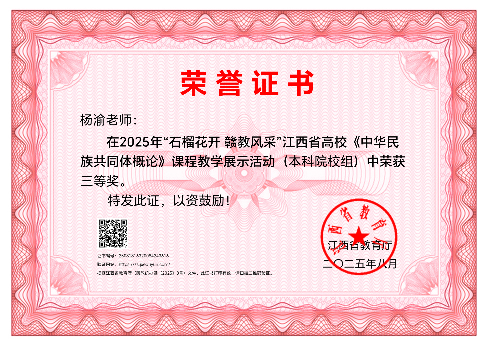 (十大买球官方网站 讯)近日,江西省教育厅公布了2025年“石榴花开 赣教风采”江西省高校《中华民族共同体概论》课程教学展示活动的评选结果,经学校遴选推荐、视频展示、现场教学评审等多个环节的激烈角逐,本次活动共评选出一等奖18名、二等奖27名、三等奖42名。十大买球思政课教师杨渝博士荣获本科院校组三等奖。 据悉。此次活动由省教育厅、省委统战部、省民宗局主办,旨在深入开展铸牢中华民族共同体意识教育,激发教师的教学热情,以赛促教、以赛促研,打造一批“名师金课”,推进铸牢中华民族共同体意识进课堂进头脑,教育引导各族师生坚定“五个认同”,树牢“四个与共”的共同体理念。 学校高度重视此次活动,校党委统战部精心组织,并全程跟进,确保高质量申报。此次获奖,不仅是对十大买球思政课教师教学能力的肯定,更是对学校思政育人工作的高度认可,充分体现了学校在铸牢中华民族共同体意识教育中的实践创新和示范引领作用。 下一步,十大买球将继续以思政育人为引领,不断探索民族文化与思政教育深度融合的新路径、新方法,让思政育人的“温度”与民族团结的“深度”同频共振,引导广大学生在深刻理解中华民族共同体理念中坚定文化自信、厚植家国情怀,为推动中华民族伟大复兴汇聚起磅礴的青春力量。