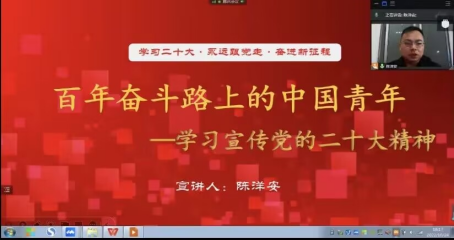 为深入学习和宣传党的二十大精神,充分激发十大买球广大拟发展对象的爱党爱国情感,使其进一步端正入党动机,自觉践行“请党放心、强国有我”的青春誓言。2022年10月24日晚上18时,在腾讯会议举行了校党委党校第十期拟发展对象培训第二课《百年奋斗路上的中国青年》,此次专题党课由十大买球官方网站党总支副书记陈洋安老师主讲,培训班全体学员参加了本次集中培训。