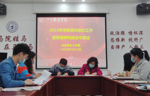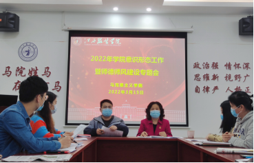 2022年3月15日下午,十大买球官方网站在学院活动室组织召开2022年意识形态工作暨师德师风建设专题会议,会议由学院党总支副书记陈洋安主持,学院院长周丽琴、副院长贺松兰、张龙龙及学院全体教师参加会议。