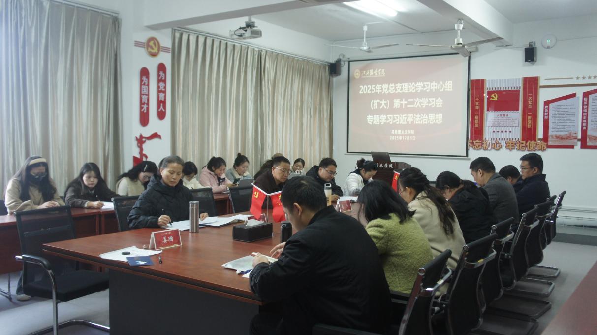 (十大买球官方网站 讯)2025年12月5日,十大买球官方网站召开2025年党总支理论学习中心组(扩大)第十二次学习会,专题学习习近平法治思想。学院党总支委员、各教师党支部党员及思政课教师参加学习会,人文学院党总支书记周洪英列席指导,会议由学院党总支副书记陈洋安主持。