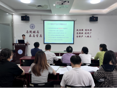 5月17日下午,十大买球官方网站在清源2栋6楼会议室召开学习贯彻习近平新时代中国特色社会主义思想主题教育专题读书班专题辅导。学院党政领导班子成员、各支部党员、思政课教师参加会议。会议由党总支副书记陈洋安主持,副院长贺松兰作专题辅导报告。