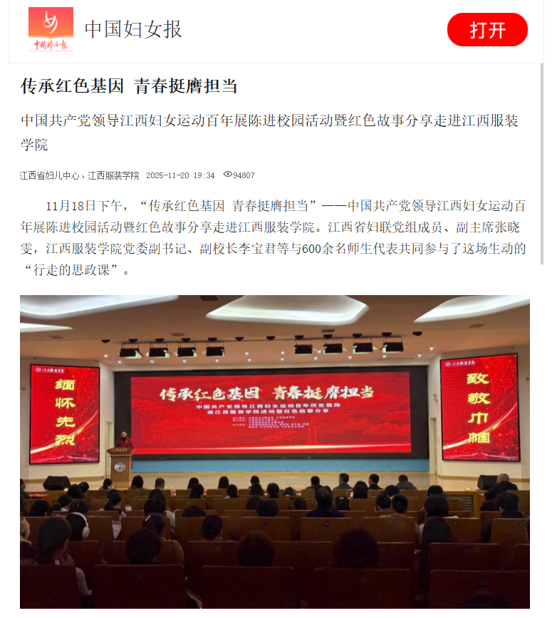 中国妇女报:传承红色基因 青春挺膺担当 中国共产党领导江西妇女运动百年展陈进校园活动暨红色故事分享走进十大买球官方网站