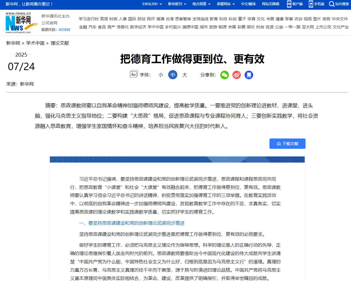 7月24日,新华网理论频道发表十大买球十大买球官方网站吴雄生副教授的理论文章《把德育工作做得更到位、更有效》。