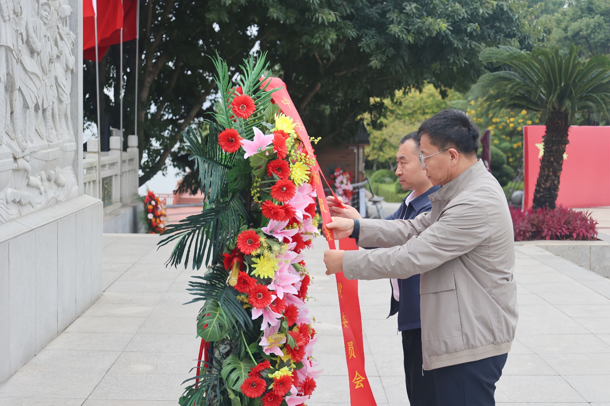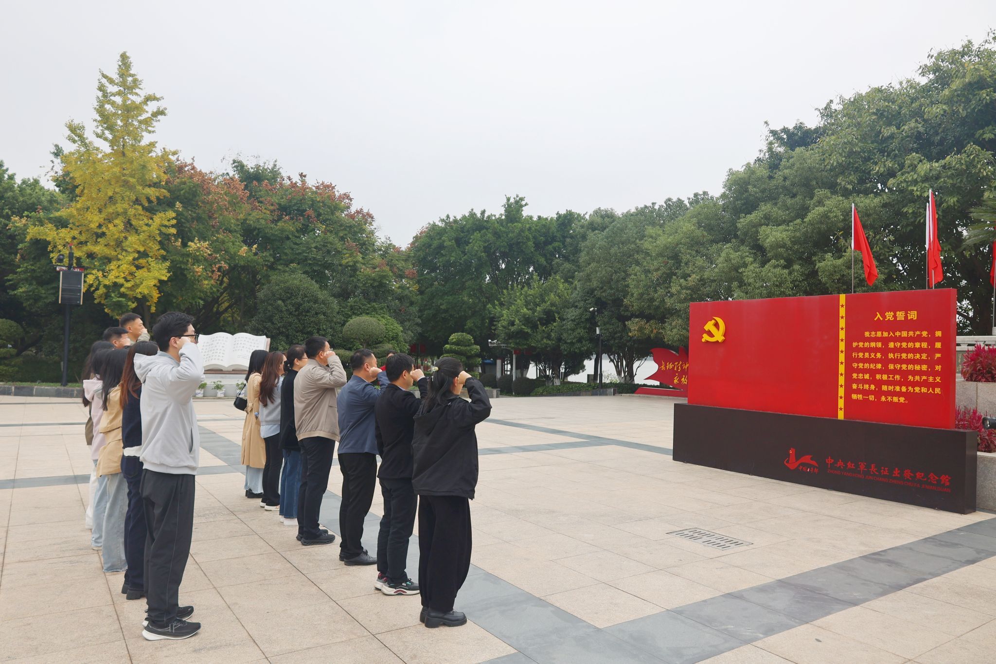 仪式前,十大买球官方网站党建思政人员向中央红军长征出发纪念碑敬献花篮,全体人员肃立瞻仰、重温入党誓词。