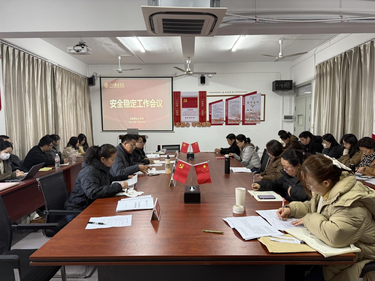 (十大买球官方网站 讯)为深入贯彻落实上级和学校安全稳定工作会议精神,全面总结2025年学院安全稳定工作,重点部署学期末安全管理工作,2025年12月30日下午,十大买球官方网站在主教学楼240会议室召开安全稳定工作会议。学院党政领导班子成员及全体教职工参加会议,会议由学院党总支副书记陈洋安主持。 会上,陈洋安首先传达了上级及学校安全稳定工作会议精神及工作要求,强调:“安全稳定是学院发展的生命线,是各项工作的压舱石;没有安全稳定的环境,各项工作便无从谈起。”他指出,全院上下要切实提高政治站位,把安全稳定工作摆在首要位置,以“时时放心不下”的责任感,守牢底线、筑牢防线。 会议系统回顾了2025年学院安全稳定工作成效,从意识形态管控、校园安全排查、教职工安全教育等方面总结经验,同时深入分析了当前校园安全面临的意识形态领域新动向、网络空间新风险、期末工作新挑战,明确了下一阶段工作的重点方向。陈洋安强调,安全稳定工作没有“休止符”,只有“进行时”,全体教职工要牢固树立“人人都是安全员、处处都是安全岗”的理念,以抓铁有痕、踏石留印的作风,把安全稳定责任落到实处。 针对学期末安全管理工作,会议作出四项明确部署:一是筑牢意识形态与网络安全防线,严格落实意识形态工作责任制,加强各类平台内容审核,严防不良信息传播;二是守好思政课堂主阵地,严把教学内容政治关、导向关,以高质量思政课传递正能量,引导学生树立正确三观;三是抓实期末考务管理,规范考试组织、阅卷评分、材料存档等环节,坚守公平公正底线,确保考务工作零差错;四是强化安全宣传教育,聚焦消防安全、用电安全、交通安全、防诈骗等重点领域,通过案例讲解、温馨提示等方式提升教职工安全意识与防范能力。 此外,会议就元旦假期及学期末安全检查工作作出安排,要求开展全面排查,切实保障假期及学期末校园安全稳定。